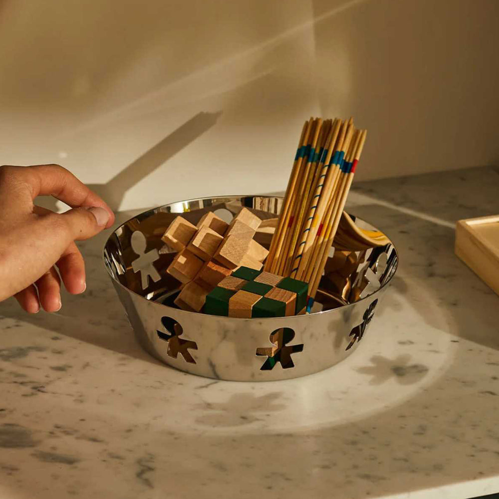 Diese 18 cm große Girotondo-Schale von Alessi ist aus Edelstahl gefertigt und mit einem filigranen, durchbrochenen Muster verziert. Die bekannten Figuren stammen vom King-Kong-Team und finden sich in vielen Alessi-Designs wieder. Die Schale wird in einer eleganten Geschenkbox geliefert.