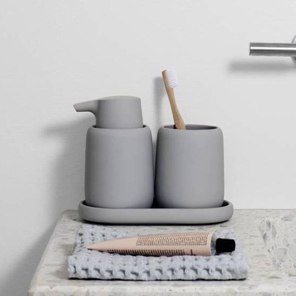 Suchen Sie einen stilvollen Zahnbürstenbecher? Dieses Modell ist aus Keramik gefertigt und verfügt über eine leicht zu reinigende, weiche Beschichtung an der Außenseite. Die Innenseite ist glasiert. Der Becher ist dunkelgrau. Weitere Accessoires der Blomus Sono-Serie sind erhältlich.