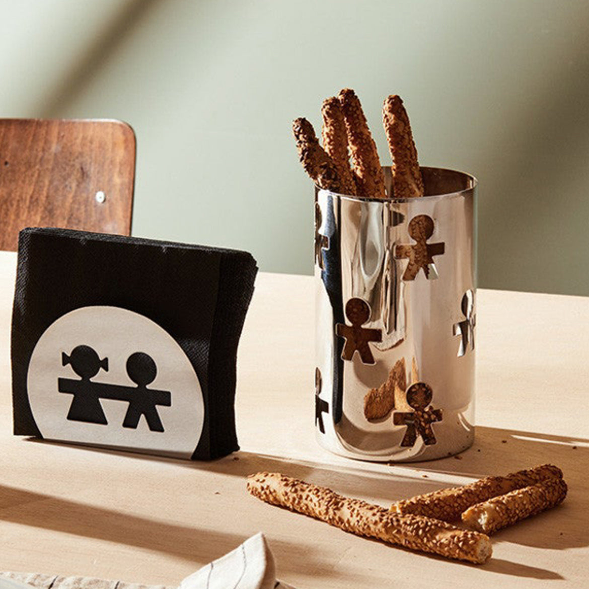 Een speelse servethouder uit de Girotondo collectie, voorzien van uitgesneden figuren aan de zijkanten. De Alessi houder is gemaakt van roestvrij staal en is zilverkleurig. Ontworpen door King-Kong en wordt geleverd in een mooie cadeauverpakking.
