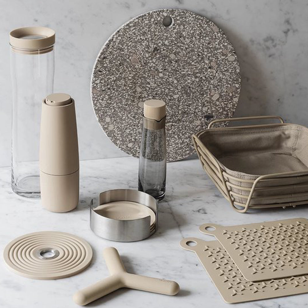 De siliconen onderzetters LARETO in de tint Moonbeam zorgen ervoor, dat er op tafel of aan de bar niets verschuift of bekrast. En mochten ze eens niet nodig zijn, dan kunnen de zes kleine hulpjes stijlvol in de roestvast stalen houder worden bewaard. Verkrijgbaar in vier andere kleuren. Design: Flöz.