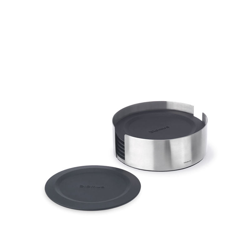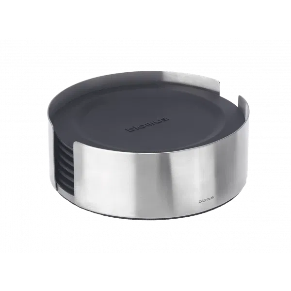 Altijd je onderzetters bij de hand met deze mooie set van Blomus. De onderzetters zijn gemaakt van siliconen dat zorgt voor een praktische antislip werking. De houder is gemaakt van duurzaam mat rvs.