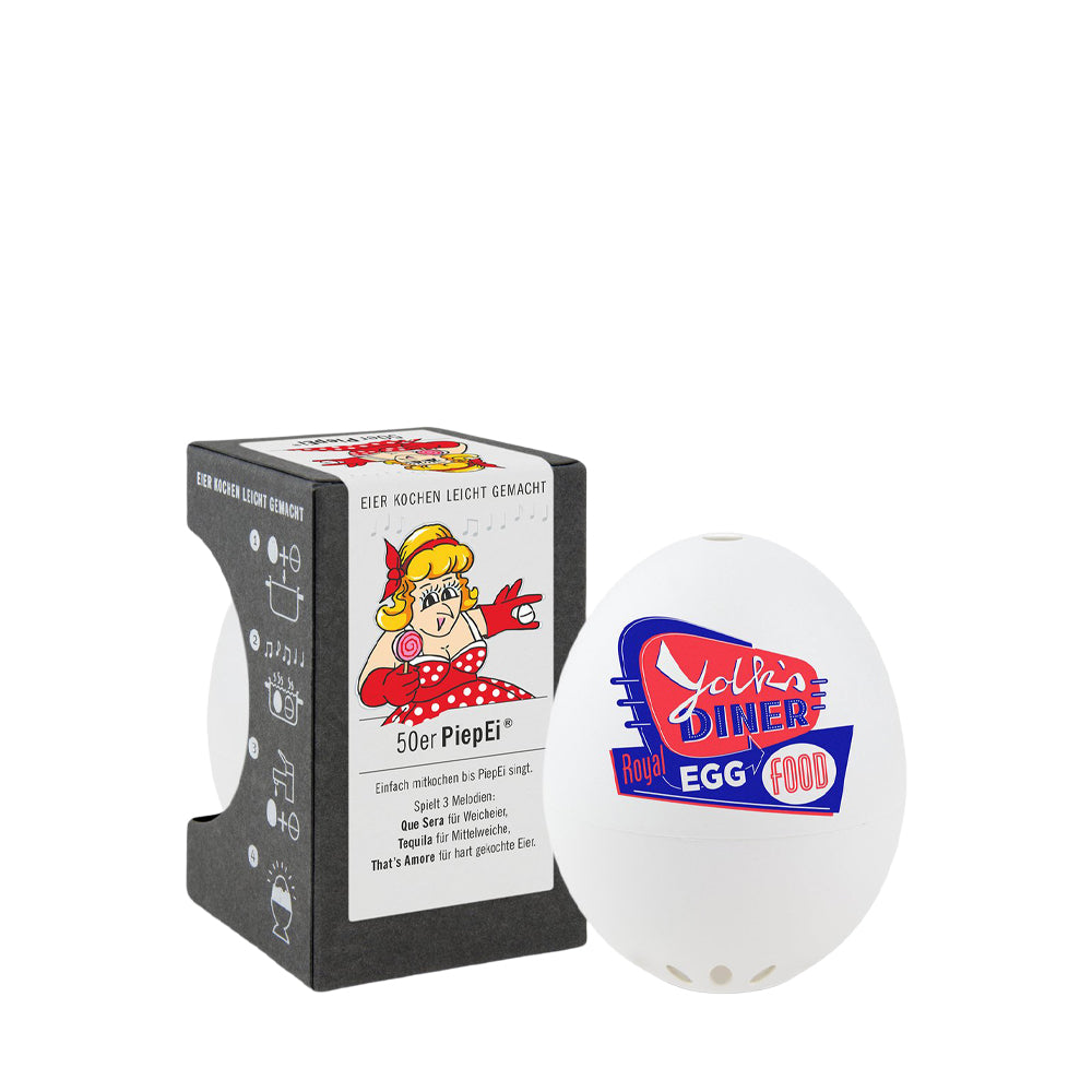 Altijd het perfect gekookte eitje met het 50's Hits PiepEi van Brutus Kookt. Bewaar je PiepEi bij de eieren zodat het dezelfde temperatuur heeft, kook het PiepEi met de eieren mee en het zal diverse melodietjes afspelen: ''Que Sera'' (voor zachtgekookt), "Tequila" (middel), "That's Amore" (hardgekookt).