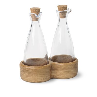 Prachtige olie- en azijnset uit Kay Bojesen's Menageri-serie, ontworpen in de jaren 40, toen Kay Bojesen begon met het maken van elegante, nuttige, houten huishoudelijke artikelen. De mondgeblazen glazen flessen zijn 15 cm hoog en hebben een kurken stop en een brede, afgewerkte eikenhouten basis. De afwerking maakt het hout minder vatbaar voor voedselvlekken, dus ze zijn perfect voor dagelijks gebruik in de keuken. De set past perfect bij de rest van de serie.