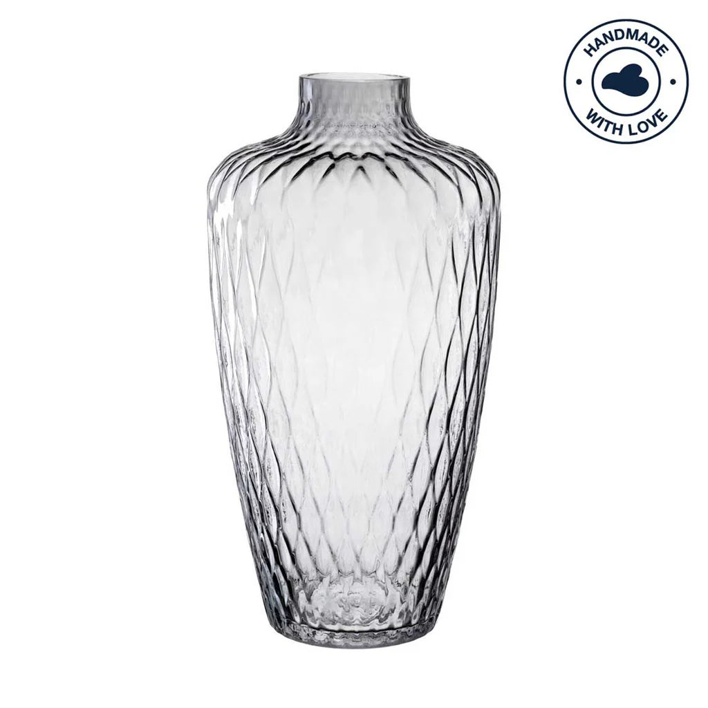 Deze handgemaakte vaas meet circa 38 cm hoog en is 20 × 20 cm in basisbreedte. Een elegant woonaccessoire voor bloemen of decoratief gebruik.
