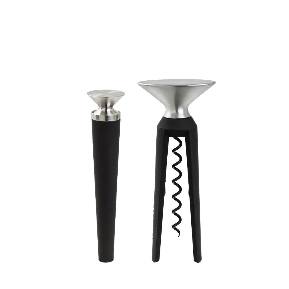 De opener heeft een verrassende, geometrische en minimalistische vorm, waardoor het openen van een fles een plezier en een avontuur wordt. Het is bekleed met zacht rubber, wat een goede grip geeft en een elegant contrast vormt met het gepolijste staal van het bovenste deel waarmee een capsule wordt geopend.