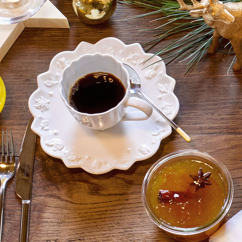 Toy's Delight Royal Classic betovert met mooie accessoires en een klassieke serie puur wit serviesgoed met hoogwaardig porselein-reliëf. Dit reliëf is versierd met sfeervolle motieven zoals hulstblaadjes en typische kerstfiguren. De collectie past prachtig bij de artikelen van Toy's Delight met hun kerstkleuren. Uit deze extra grote beker smaakt warme cacao of heerlijke eierpunch 's morgens onder de kerstboom nog beter. Vier Kerstmis met prachtige artikelen in een klassiek gereduceerde stijl.