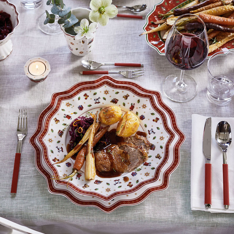 Met de collectie Toy's Delight zorgt u voor een nostalgische kerstsfeer in huis. Het servies is versierd met speelse motieven in rood, groen en wit en roept herinneringen uit de kindertijd op. Afgeronde vormen en borden met gekartelde randen vormen een grote eenheid op de gedekte tafel, maar elk stuk is op zich al een eyecatcher. Dat is niet anders met de Toy's Delight kerstboom serveerschaal, met zoveel functies dat hij de kerstsfeer op zich al creëert en ook een ideale oplossing biedt voor het serveren van taarten, gebraden vlees en kerstdelicatessen.