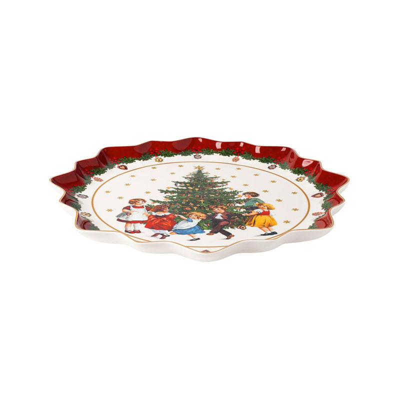Vrolijkheid, vrolijkheid en een charme die iedereen boeit: dat is de Toy's Fantasy serie van Villeroy en Boch, die zo veelzijdig kan worden gebruikt dat met elk stuk in één klap een gezellige sfeer kan worden gecreëerd door er verschillende lekkernijen op te serveren. Deze grote serveerschaal uit de collectie met het patroon van dansende kinderen rond de versierde boom brengt een vleugje plezier in het feestelijk versierde huis. Deze schaal met opstaande rand is ideaal om fruit en gebak rijkelijk te presenteren. Herbeleef het geluk van de kindertijd en voel nostalgische gevoelens voor de intieme momenten.